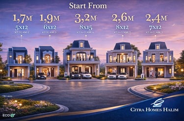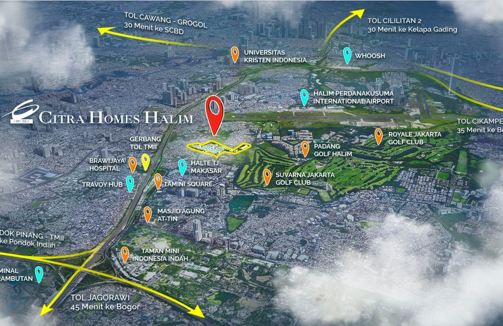 Berlokasi di kawasan Halim Perdana Kusuma, Citra Homes Halim hadir dengan keunggulan lokasi yang sangat strategis di Jakarta Timur. Kawasan ini menempel langsung dengan area Golf Halim, menghadirkan suasana hunian yang tenang, rindang, dan eksklusif di tengah kota. Didukung akses yang sangat mudah ke Bandara Halim Perdana Kusuma serta dekat dengan LRT, Busway, dan Kereta Cepat Whoosh, menjadikan mobilitas Anda semakin cepat dan praktis.